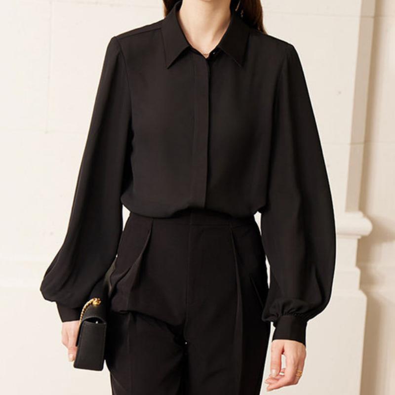 The loose fit and lantern sleeves offer a relaxed yet refined silhouette, while the turn-down collar adds a classic touch. This blouse’s midweight fabric makes it perfect for spring layering or wearing on its own. With no additional decoration, it maintains a clean, minimalist look that highlights its elegant design.