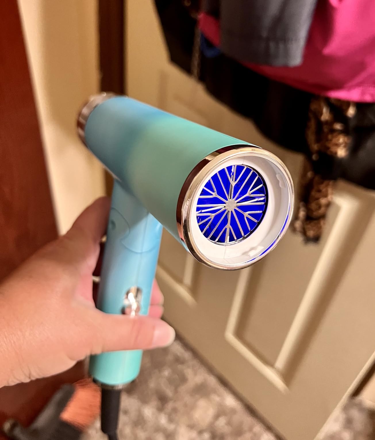 The portability of this blow dryer is outstanding; it collapses to a size just a tad bigger than a compact umbrella, making it perfect for travel. It also has a low enough wattage to be powered by my power bank during outages—a feature I value highly. The only minor inconvenience is needing to slightly adjust the prongs for a secure fit in the outlet. Besides that, its cool color and lightweight design make it a pleasure to use.