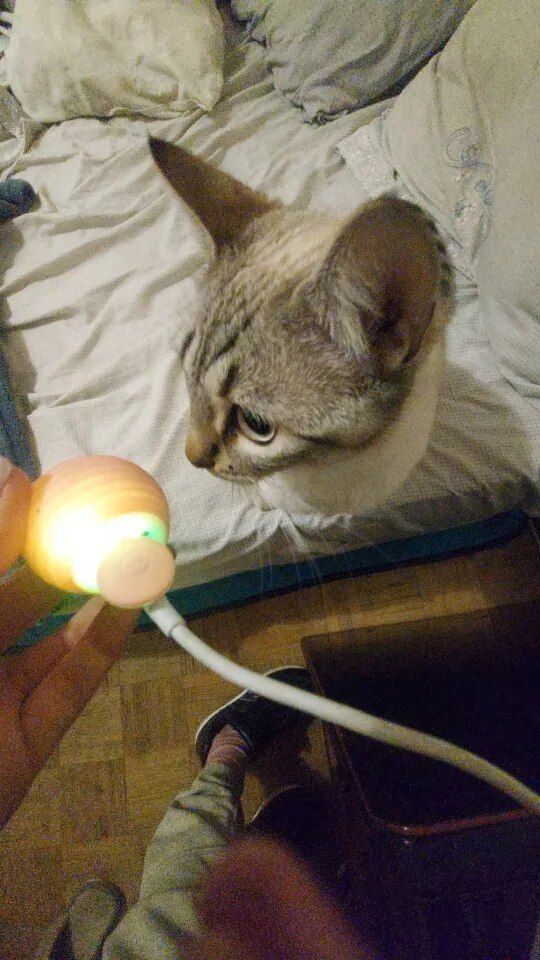 8. The ball was very good and everything arrived very quickly, it was recharged by USB so the box arrived somewhat touched but the ball that is the important thing arrived well, very happy with the purchase and my cat still liked it a lot, Has light while the ball moves changes color I recommend it is fine for the cat to play.